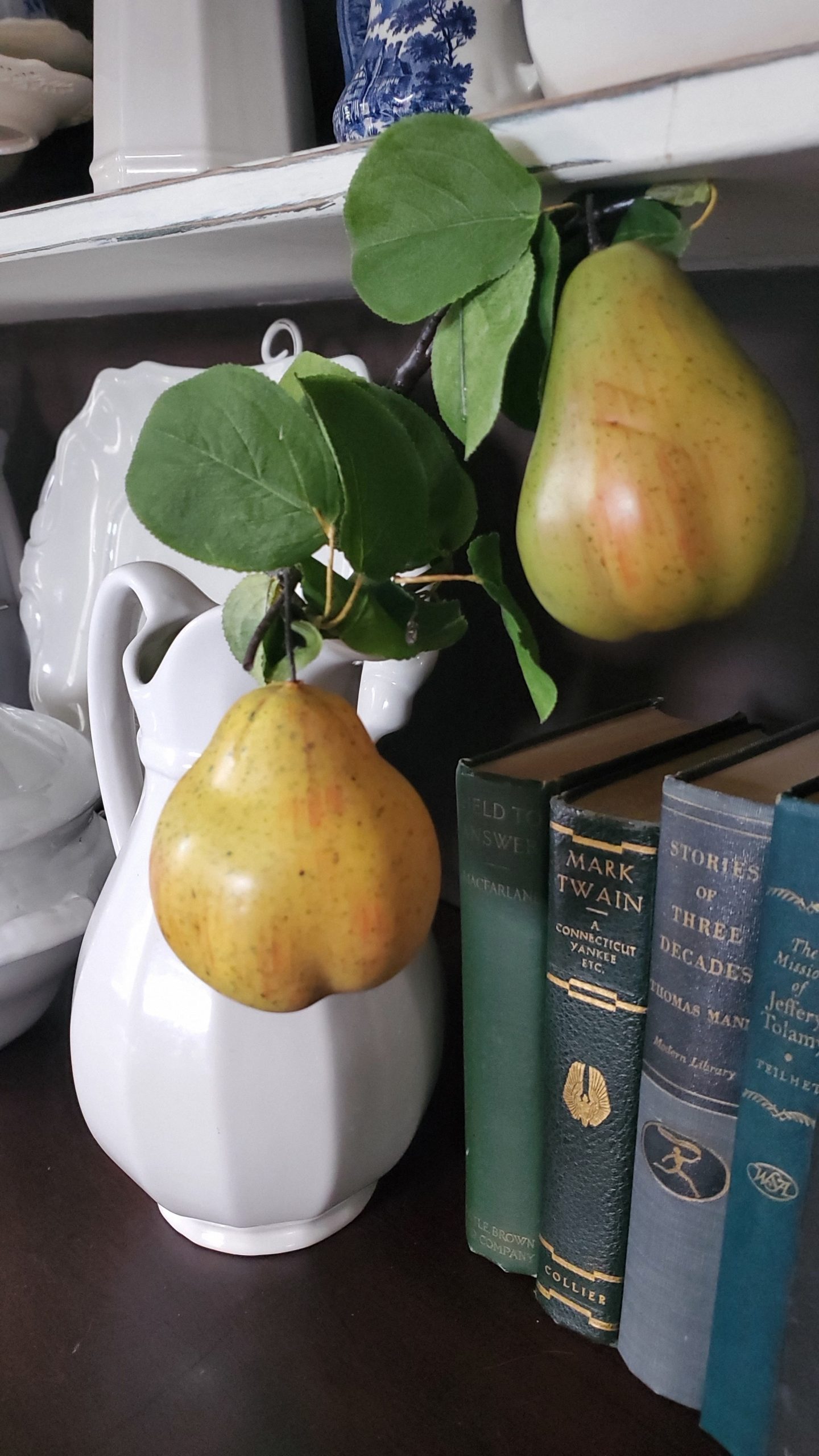 In the right photo is a large white antique pitcher on my fireplace mantle.